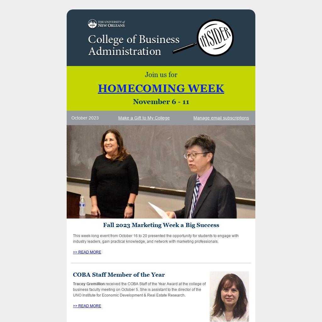 Tracey Gremillion received the COBA Staff of the Year Award at the college of business faculty meeting on October 5. She is assistant to the director of the UNO Institute for Economic Development & Real Estate Research.