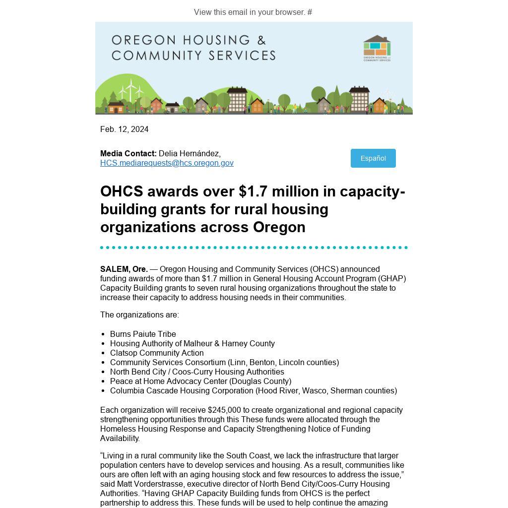 “Our rural and Tribal partners are essential in advancing progress on Oregon’s housing. It is crucial that we do our part toward ensuring rural Oregon has the tools and resources needed to deploy regionalized strategies,” said OHCS Director Andrea Bell. “We are pleased to provide this funding so these organizations can develop the infrastructure necessary to create housing solutions specific to the needs in their communities.”