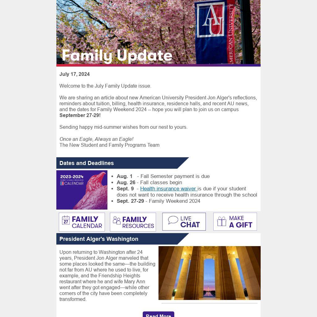 We are sharing an article about new American University President Jon Alger's reflections, reminders about tuition, billing, health insurance, residence halls, and recent AU news, and the dates for Family Weekend 2024 -- hope you will plan to join us on campus September 27-29!