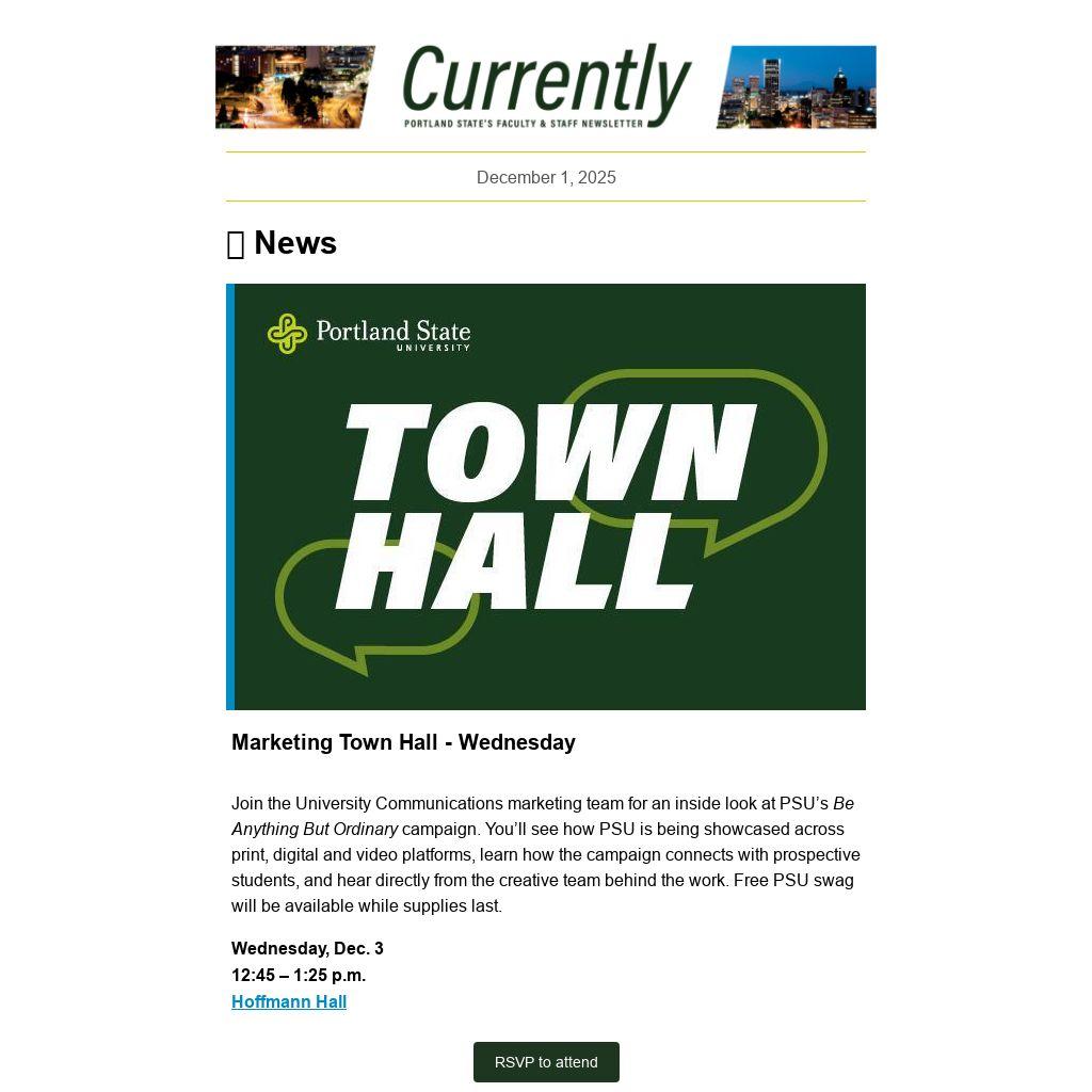 CURRENTLY is a weekly newsletter for the employees of Portland State University, published by University Communications. News items, events and accolades should be sent to currently@pdx.edu. Deadline is noon, the Tuesday before publication. See the Currently website for submission guidelines and schedule.