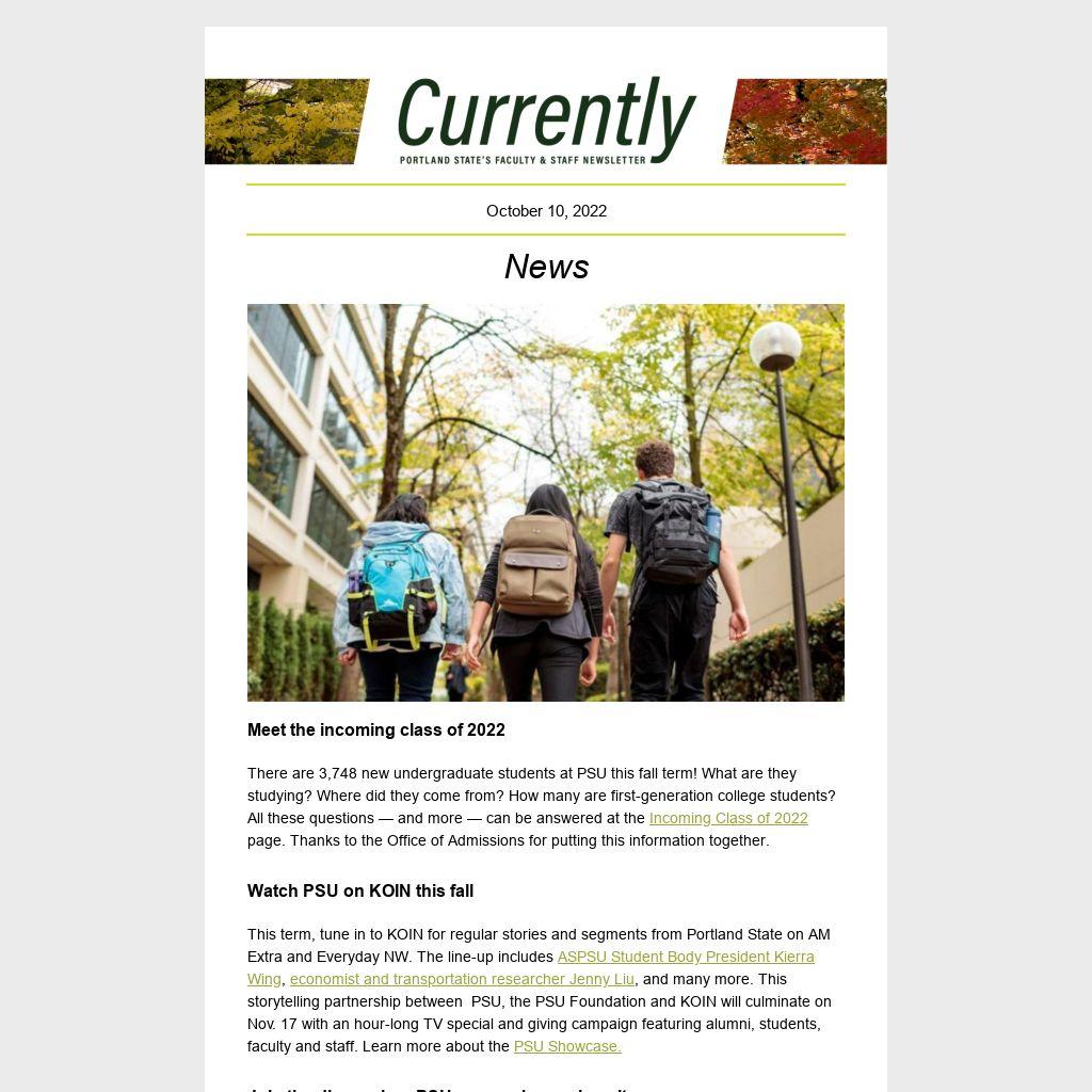 Currently is Portland State University's weekly faculty and staff newsletter. It is published online every Monday during the academic year. News items should be emailedby noon the Tuesday before publication. See theCurrently website for submission guidelines and schedule.