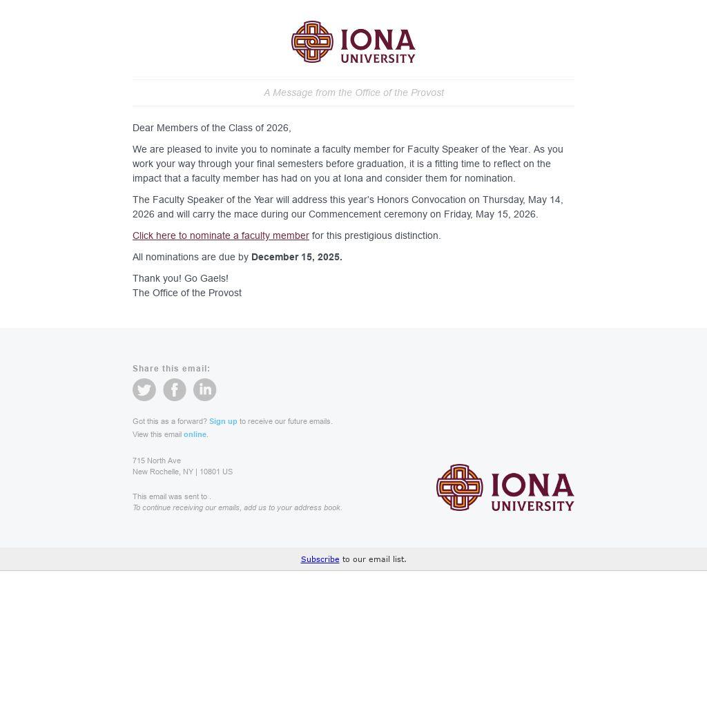 We are pleased to invite you to nominate a faculty member for Faculty Speaker of the Year. As you work your way through your final semesters before graduation, it is a fitting time to reflect on the impact that a faculty member has had on you at Iona and consider them for nomination.