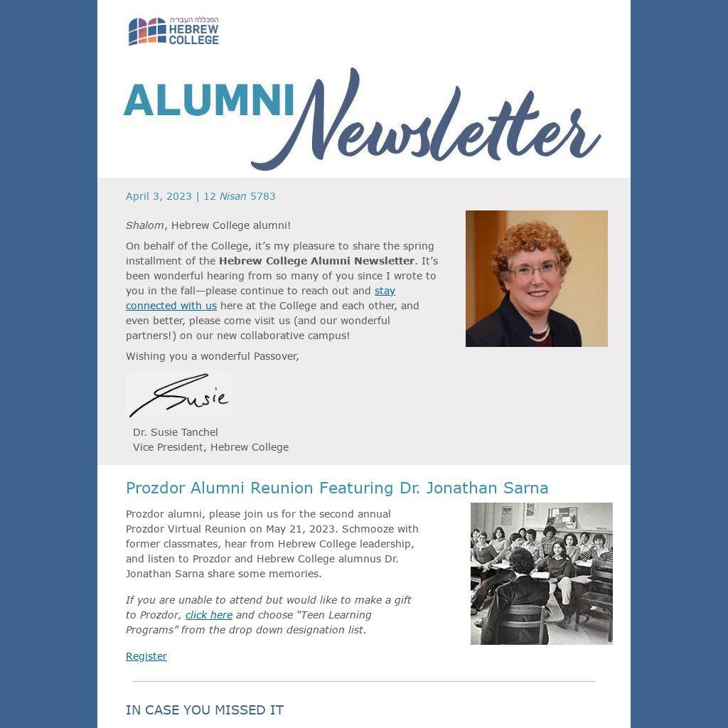 Prozdor alumni, please join us for the second annual Prozdor Virtual Reunion on May 21, 2023. Schmooze with former classmates, hear from Hebrew College leadership, and listen to Prozdor and Hebrew College alumnus Dr. Jonathan Sarna share some memories.