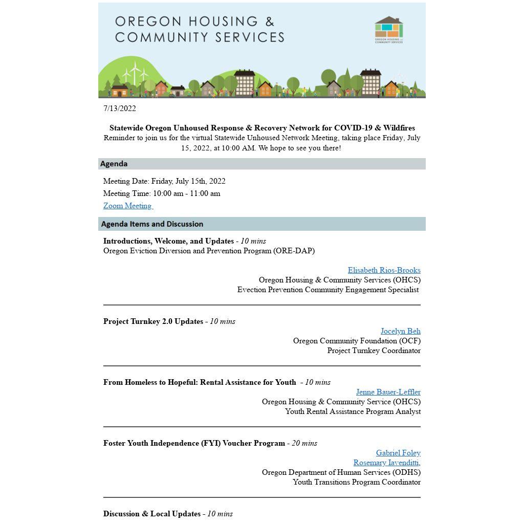 Reminder to join us for the virtual Statewide Unhoused Network Meeting, taking place Friday, July 15, 2022, at 10:00 AM. We hope to see you there!