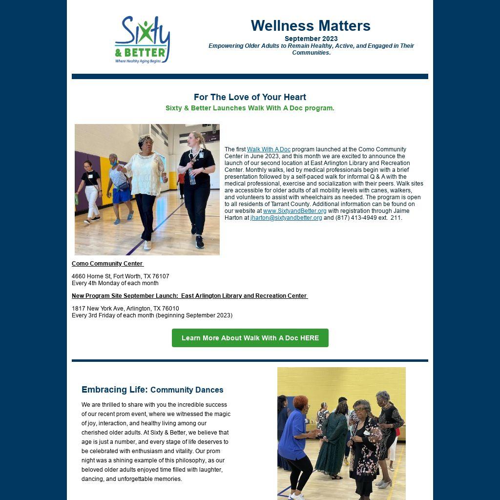 The first Walk With A Doc program launched at the Como Community Center in June 2023, and this month we are excited to announce the launch of our second location at East Arlington Library and Recreation Center. Monthly walks, led by medical professionals begin with a brief presentation followed by a self-paced walk for informal Q & A with the medical professional, exercise and socialization with their peers. Walk sites are accessible for older adults of all mobility levels with canes, walkers, and volunteers to assist with wheelchairs as needed. The program is open to all residents of Tarrant County. Additional information can be found on our website at www.SixtyandBetter.org with registration through Jaime Harton at jharton@sixtyandbetter.org and (817) 413-4949 ext. 211.