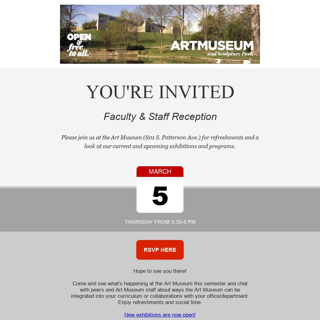 Come and see what's happening at the Art Museum this semester and chat with peers and Art Museum staff about ways the Art Museum can be integrated into your curriculum or collaborations with your office/department. Enjoy refreshments and social time.