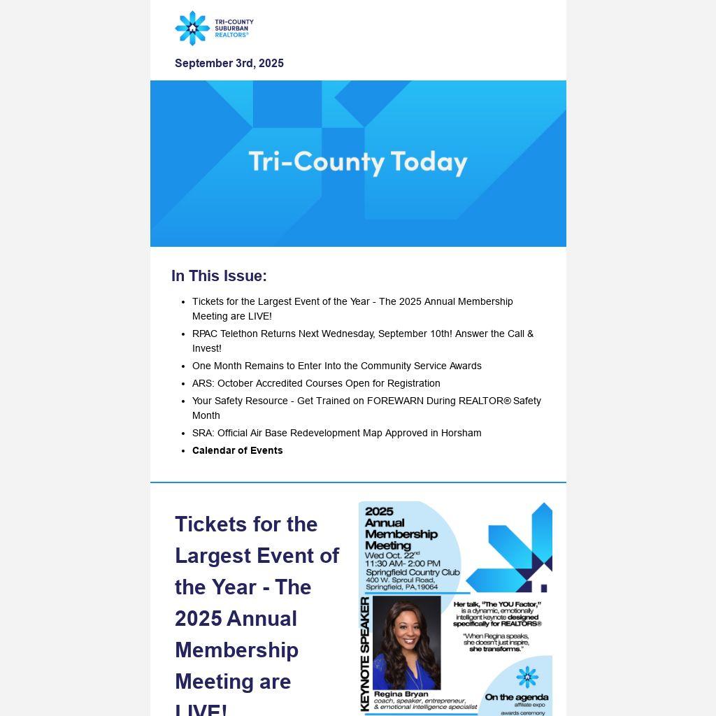 Tri-County Suburban REALTORS® 2025 Annual Membership Meeting will return to Springfield Country Club on October 22nd!