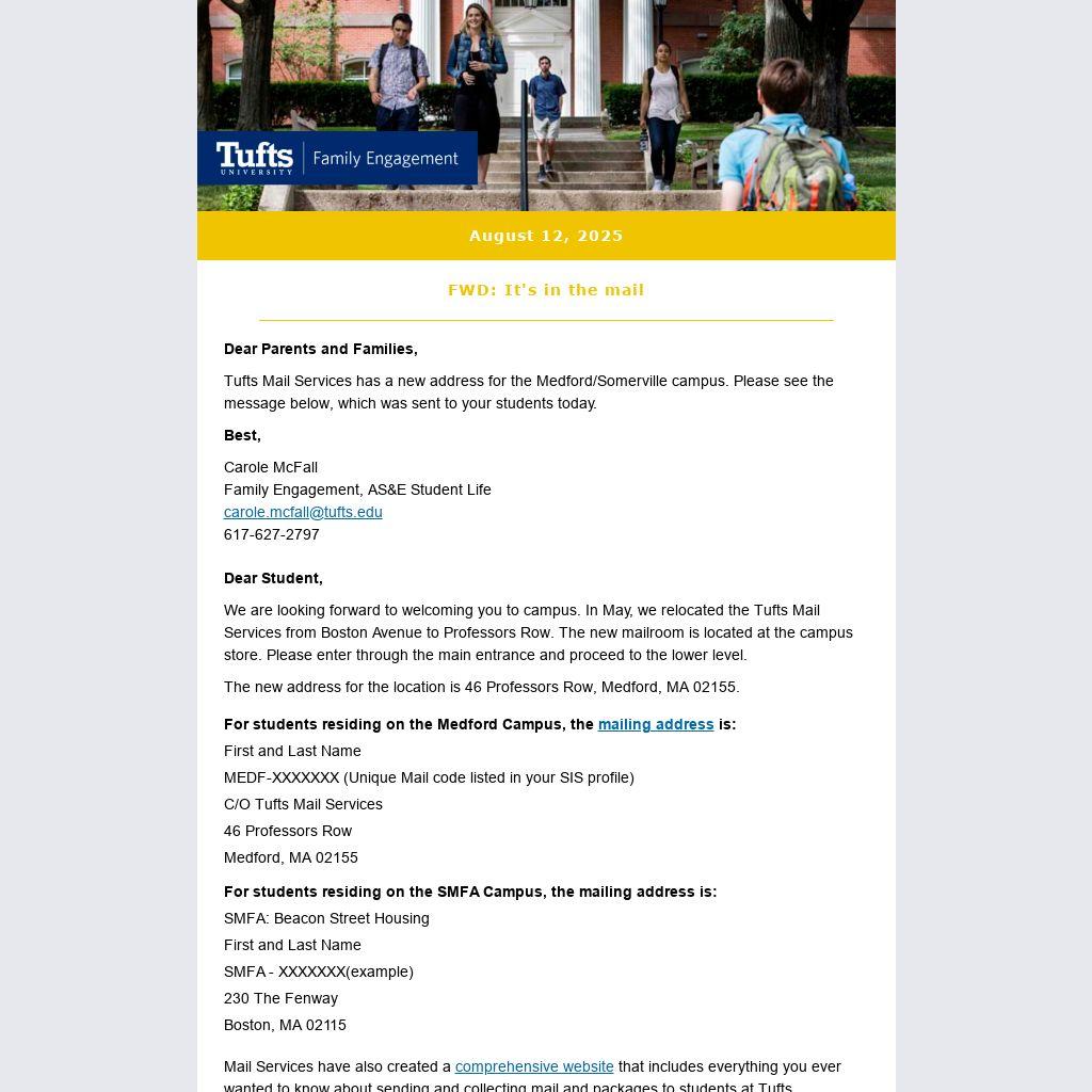 Tufts Mail Services has a new address for the Medford/Somerville campus. Please see the message below, which was sent to your students today.