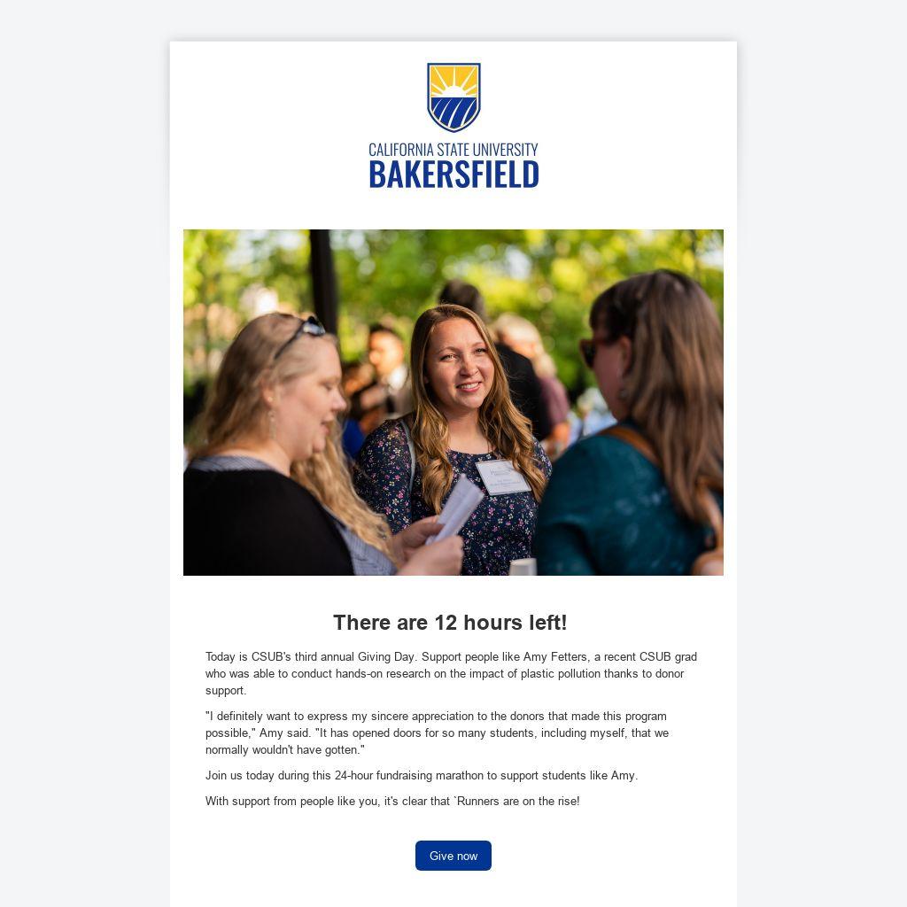 Today is CSUB's third annual Giving Day. Support people like Amy Fetters, a recent CSUB grad who was able to conduct hands-on research on the impact of plastic pollution thanks to donor support.