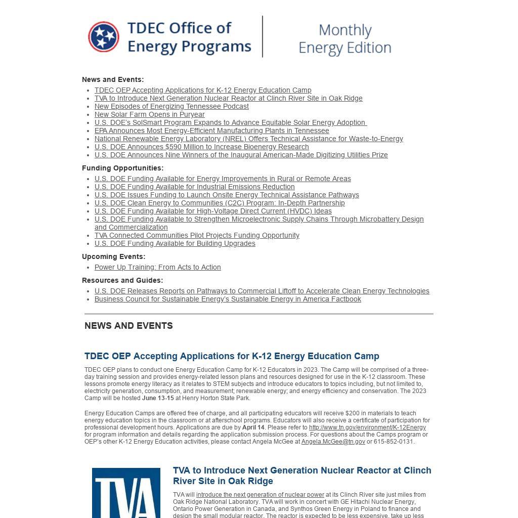 TDEC OEP Accepting Applications for K-12 Energy Education Camp |