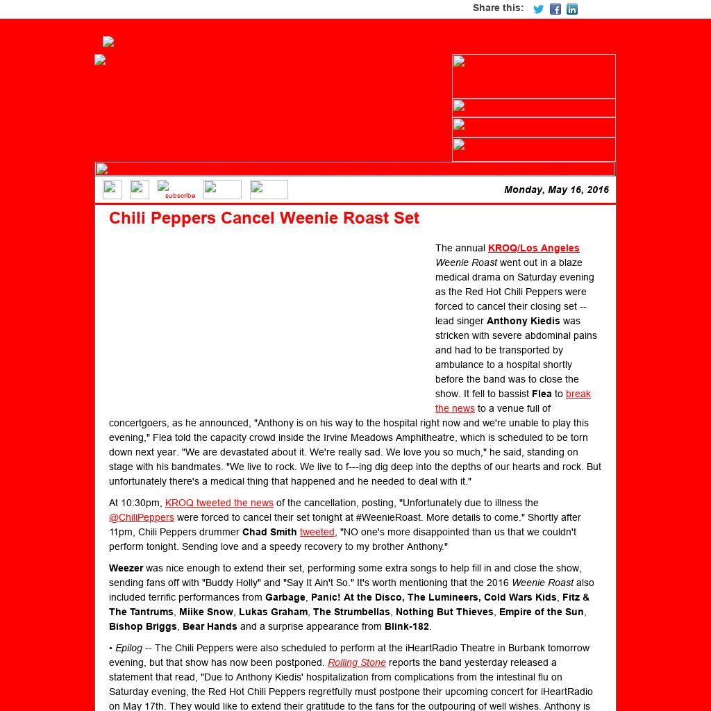At 10:30pm, KROQ tweeted the news of the cancellation, posting, "Unfortunately due to illness the @ChiliPeppers were forced to cancel their set tonight at #WeenieRoast. More details to come." Shortly after 11pm, Chili Peppers drummer Chad Smith tweeted, "NO one's more disappointed than us that we couldn't perform tonight. Sending love and a speedy recovery to my brother Anthony."