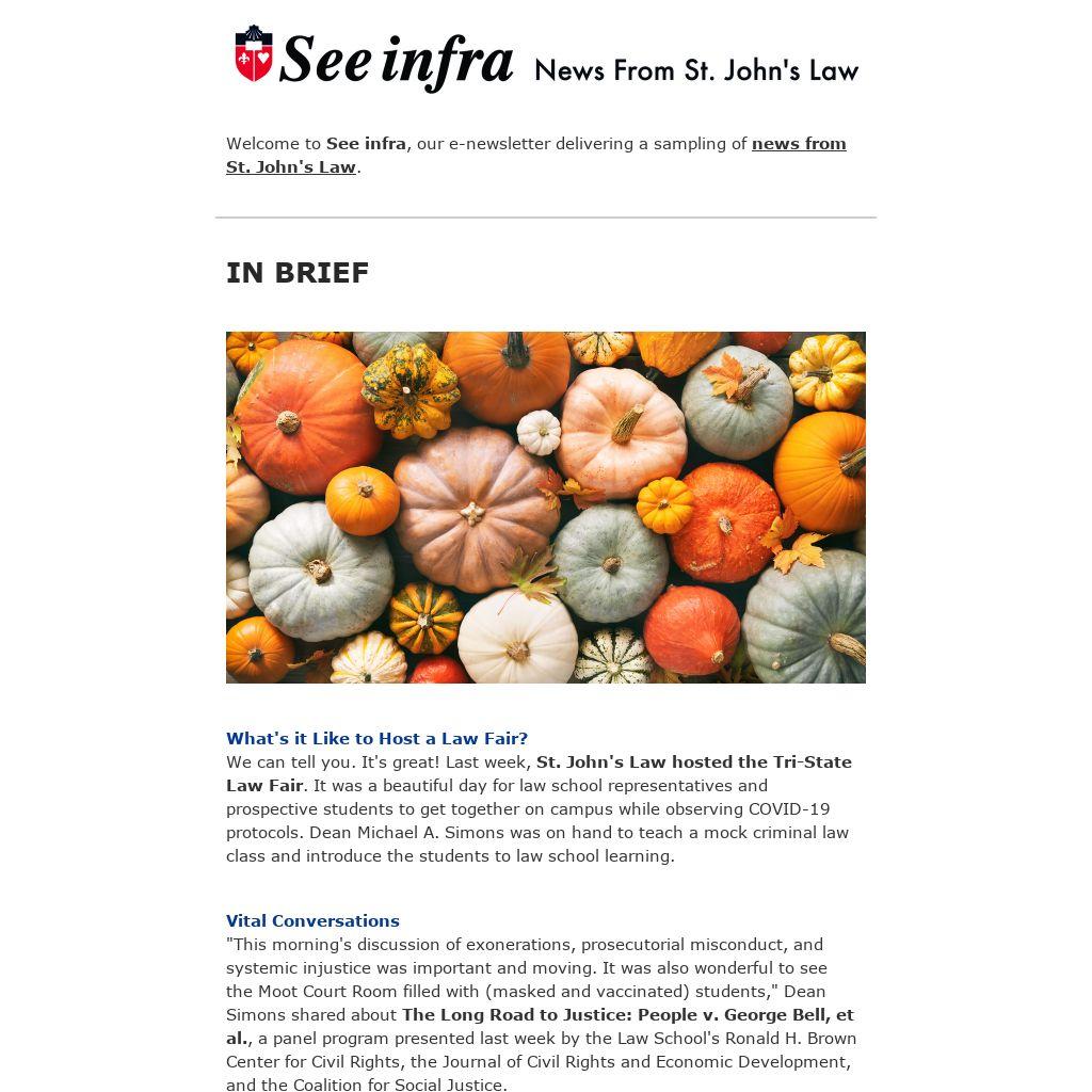 Let's Go for a Run (Or Jog, Or Walk) The St. John's Law Alumni Association's Alumni of Color Chapter is back with its 5K Run for Racial Justice on 10/30. This year, you can join us on campus to run, jog, or walk a fun outdoor course, or participate virtually from wherever you like. From near or far, with each stride you'll show and share your support for the critical work of acknowledging and dismantling systemic racism. Watch your inbox for more details.