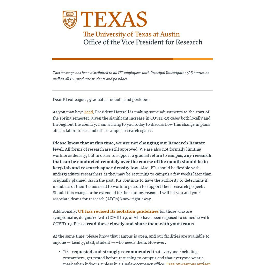 This message has been distributed to all UT employees with Principal Investigator (PI) status, as well as all UT graduate students and postdocs.