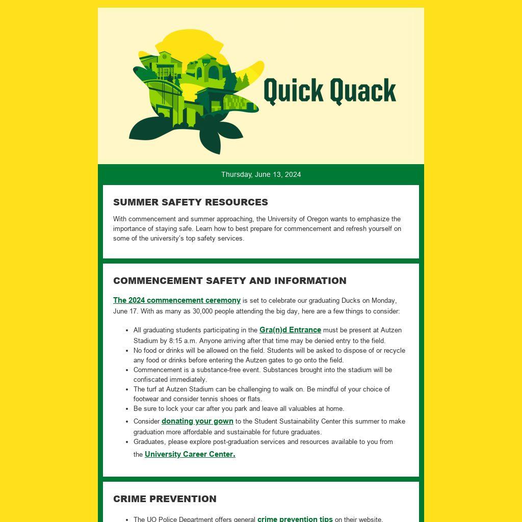 With commencement and summer approaching, the University of Oregon wants to emphasize the importance of staying safe. Learn how to best prepare for commencement and refresh yourself on some of the university’s top safety services.