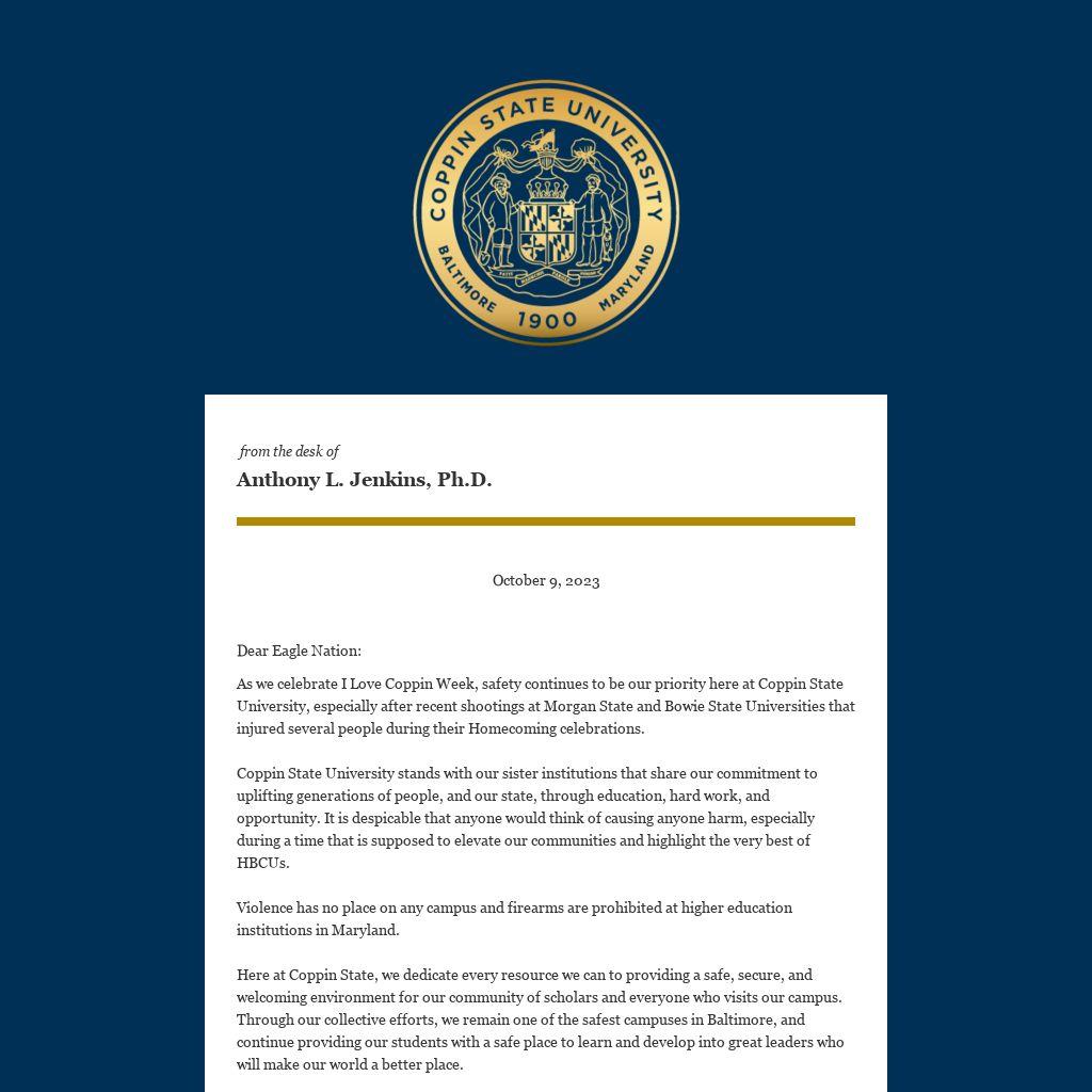 As we celebrate I Love Coppin Week, safety continues to be our priority here at Coppin State University, especially after recent shootings at Morgan State and Bowie State Universities that injured several people during their Homecoming celebrations.