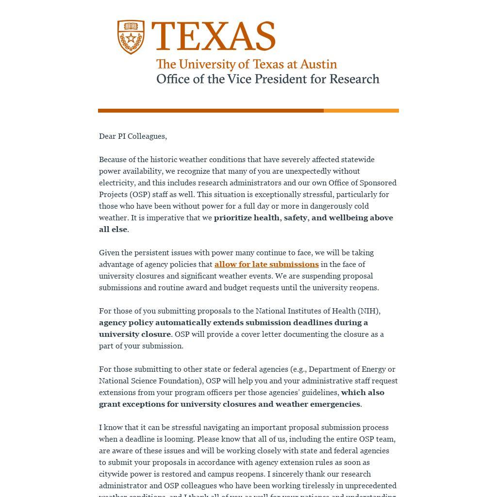 Because of the historic weather conditions that have severely affected statewide power availability, we recognize that many of you are unexpectedly without electricity, and this includes research administrators and our own Office of Sponsored Projects (OSP) staff as well. This situation is exceptionally stressful, particularly for those who have been without power for a full day or more in dangerously cold weather. It is imperative that we prioritize health, safety, and wellbeing above all else.