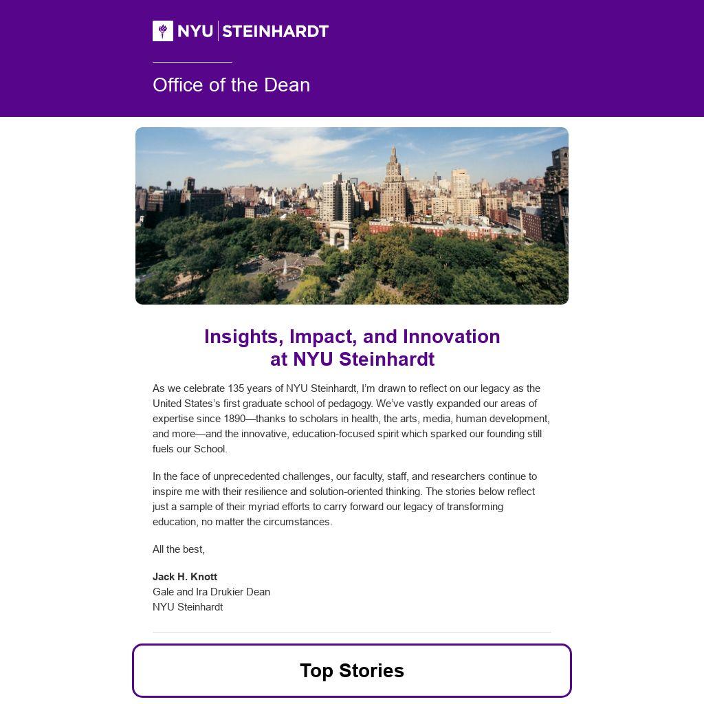 As we celebrate 135 years of NYU Steinhardt, I’m drawn to reflect on our legacy as the United States’s first graduate school of pedagogy. We’ve vastly expanded our areas of expertise since 1890—thanks to scholars in health, the arts, media, human development, and more—and the innovative, education-focused spirit which sparked our founding still fuels our School.
