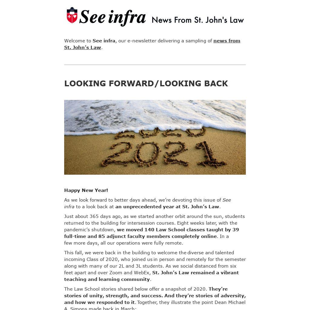 As we look forward to better days ahead, we’re devoting this issue of See infra to a look back at an unprecedented year at St. John’s Law.