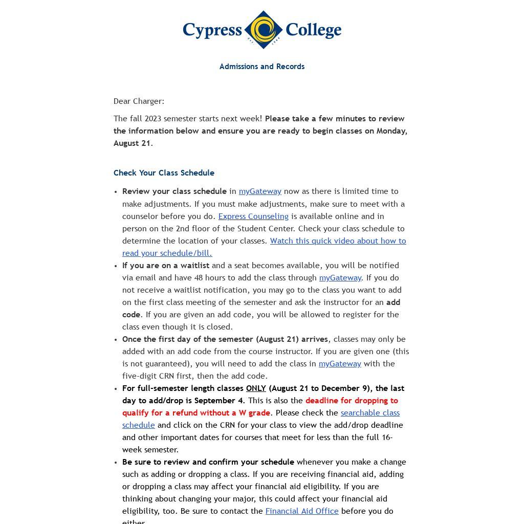 For additional information about enrollment policies and procedures, please visit the Admissions and Records website or review the college catalog. Meanwhile, on behalf of the administration, faculty, and staff at Cypress College, please accept my best wishes for a successful fall semester!
