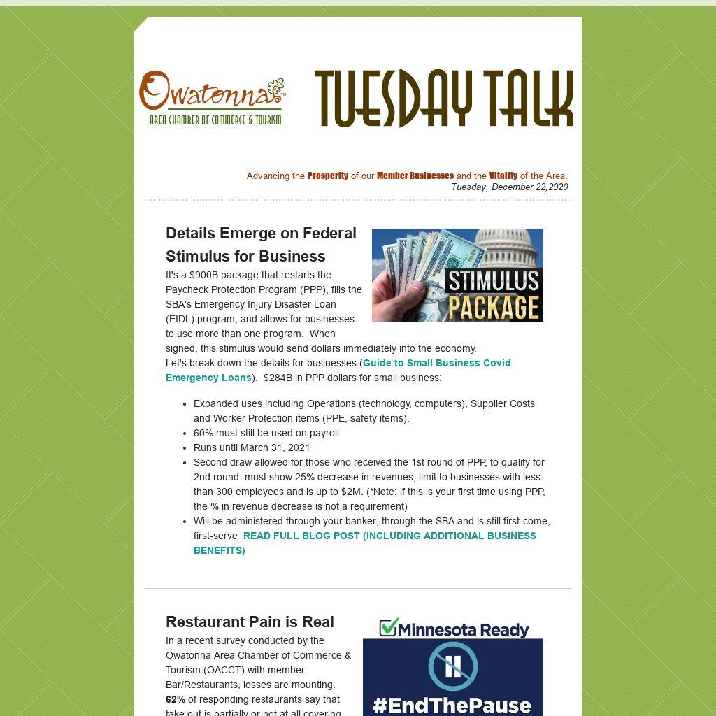 Restaurant Pain is RealIn a recent survey conducted by the Owatonna Area Chamber of Commerce & Tourism (OACCT) with member Bar/Restaurants, losses are mounting. 62% of responding restaurants say that take out is partially or not at all covering their expenses of operation. They unanimously replied that take out or gift cards are the best way for locals to support their business.