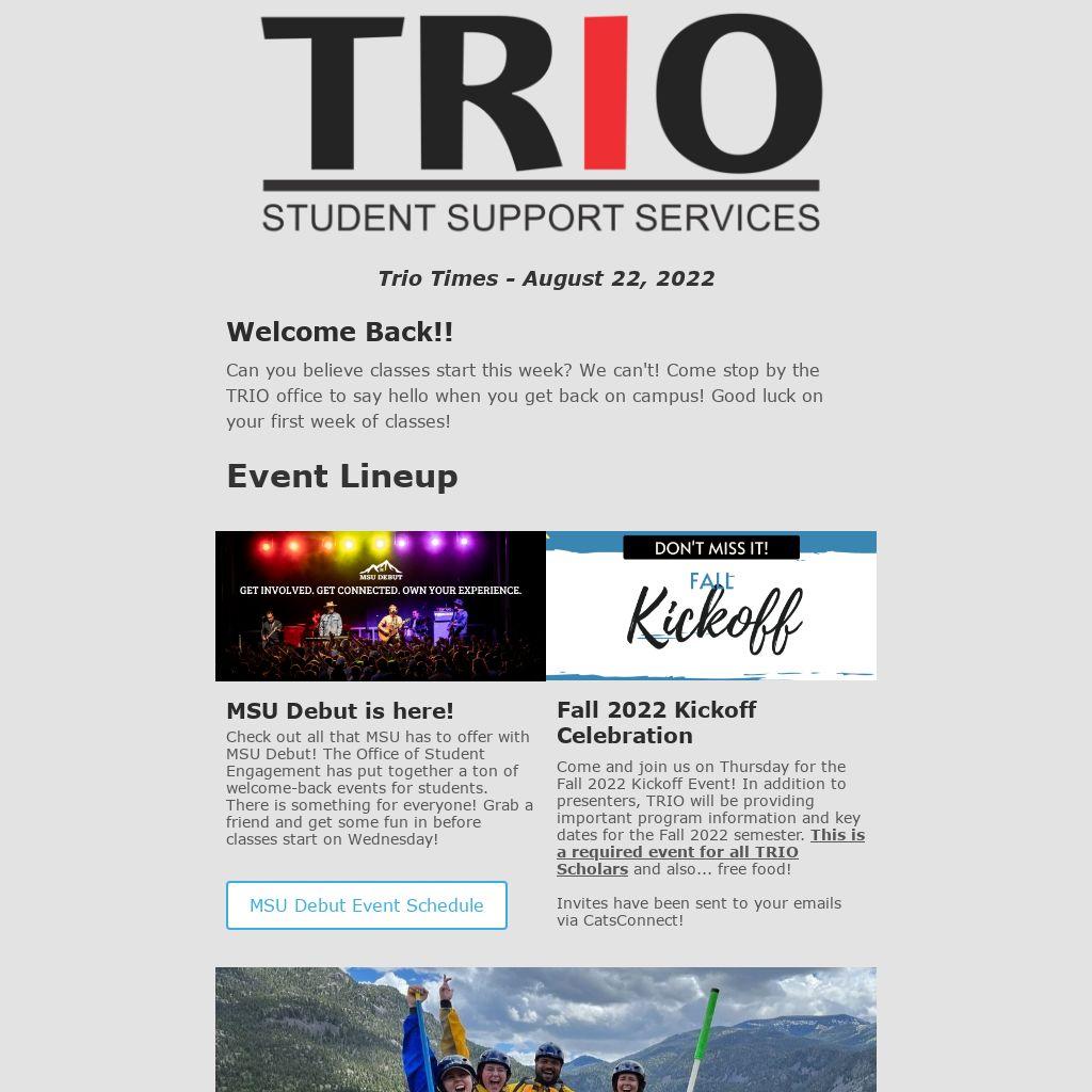 We are partnering with Outdoor Recreation to bring you a day of whitewater rafting, team building, and fun on the river! Come and join your fellow TRIO SSS Scholars, staff, and GEAR UP Students for a fun day of adventure the Saturday after classes start. It is the perfect opportunity to make friends, decompress from the busy week, and get to know your TRIO SSS Staff Members! This is completely free for TRIO Scholars and transportation will be provided to and from the river!
