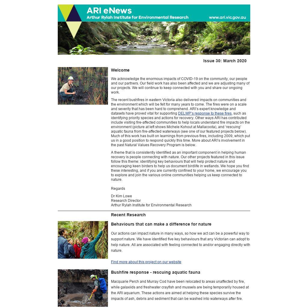 The aquatic edition features updates on Freshwater Catfish relocation, involvement in the response to the recent bushfires, completion of the Carp biomass estimate project, rediscovery of the Purple-spotted Gudgeon, and staff presentations and publications.