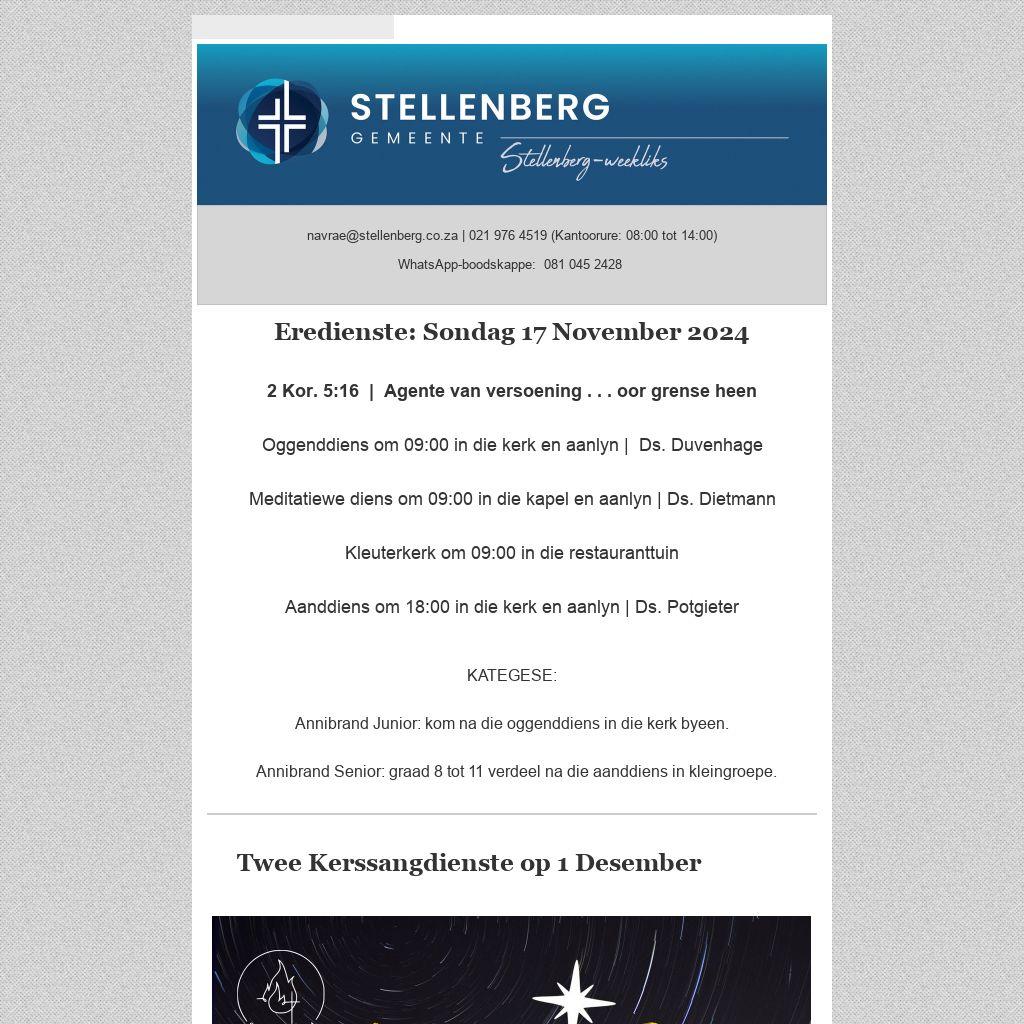Plaas gerus ’n advertensie in die Stellenberg-weekliks. Die nuusblad word tans weekliks elektronies aan 2 500 persone gestuur en is ook op die gemeente se webwerf beskikbaar. Advertensies sal slegs aanlyn beskikbaar wees en word nie in gedrukte formaat uitgegee nie. Lees meer . . .