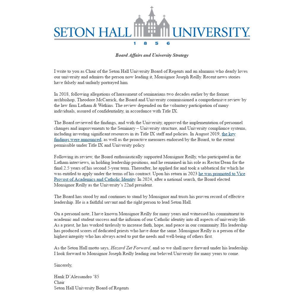 I write to you as Chair of the Seton Hall University Board of Regents and an alumnus who dearly loves our university and admires the person now leading it, Monsignor Joseph Reilly. Recent news stories have falsely and unfairly portrayed him.