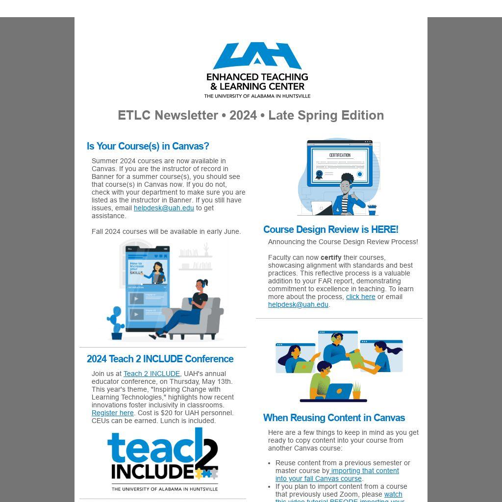 Summer 2024 courses are now available in Canvas. If you are the instructor of record in Banner for a summer course(s), you should see that course(s) in Canvas now. If you do not, check with your department to make sure you are listed as the instructor in Banner. If you still have issues, email helpdesk@uah.edu to get assistance.