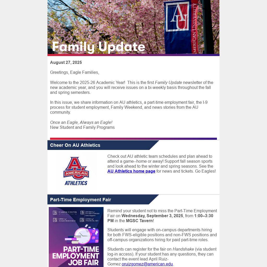 In this issue, we share information on AU athletics, a part-time employment fair, the I-9 process for student employment, Family Weekend, and news stories from the AU community.