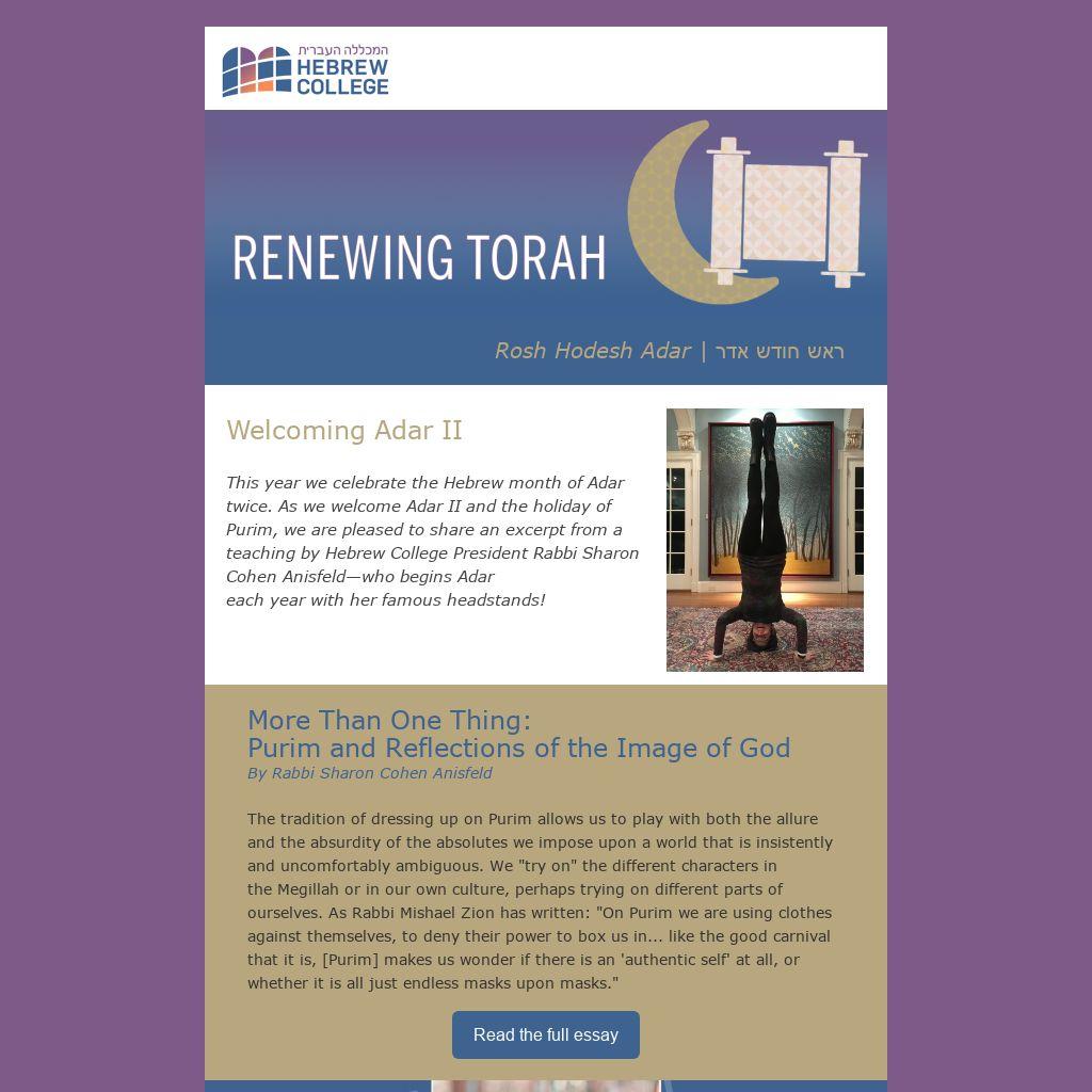 This year we celebrate the Hebrew month of Adar twice. As we welcome Adar II and the holiday of Purim, we are pleased to share an excerpt from a teaching by Hebrew College President Rabbi Sharon Cohen Anisfeld—who begins Adar each year with her famous headstands!