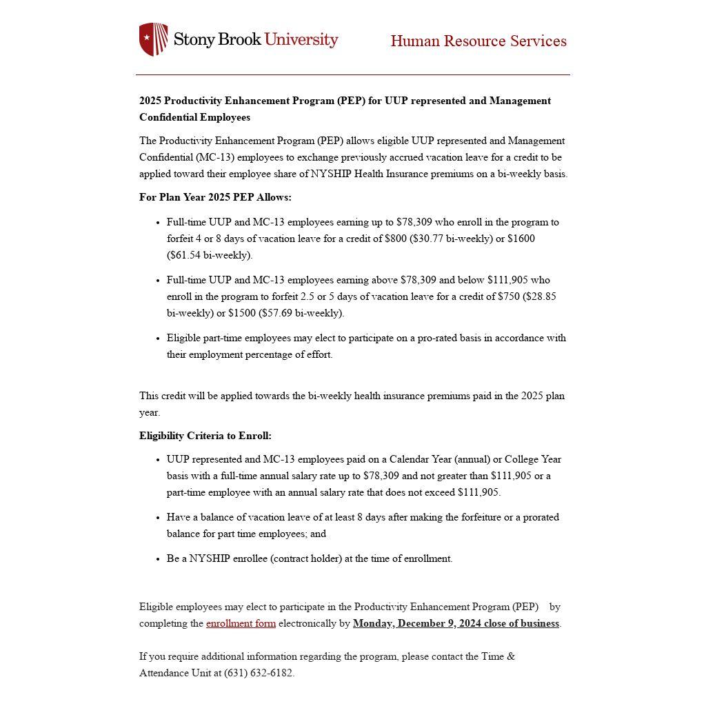 Eligible employees may elect to participate in the Productivity Enhancement Program (PEP) by completing the enrollment form electronically by Monday, December 9, 2024 close of business.
