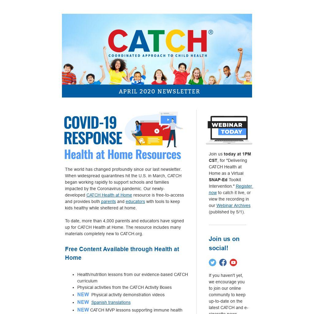 The world has changed profoundly since our last newsletter. When widespread quarantines hit the U.S. in March, CATCH began working rapidly to support schools and families impacted by the Coronavirus pandemic. Our newly-developed CATCH Health at Home resource is free-to-access and provides both parents and educators with tools to keep kids healthy while sheltered at home.