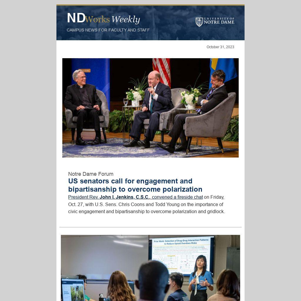 The U.S. Department of Commerce and its Economic Development Administration (EDA) awarded Notre Dame a Strategy Development Grant to lead the Midwest Wireless Innovation Strategy Development Consortium, part of the newly launched Tech Hub Programs announced by the EDA. Notre Dame is also a partner in Heartland BioWorks, a consortium of Indiana biomanufacturing stakeholders that the EDA designated as a 2023 Regional Technology and Innovation Hub.