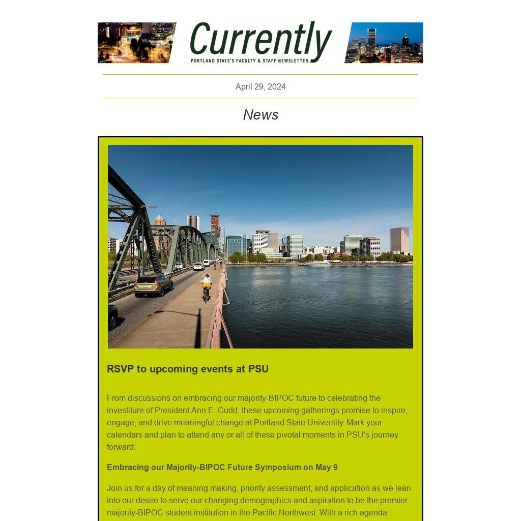 CURRENTLY is a weekly newsletter for the employees of Portland State University, published by University Communications. News items, events and accolades should be sent to currently@pdx.edu. Deadline is noon, the Tuesday before publication. See the Currently website for submission guidelines and schedule.