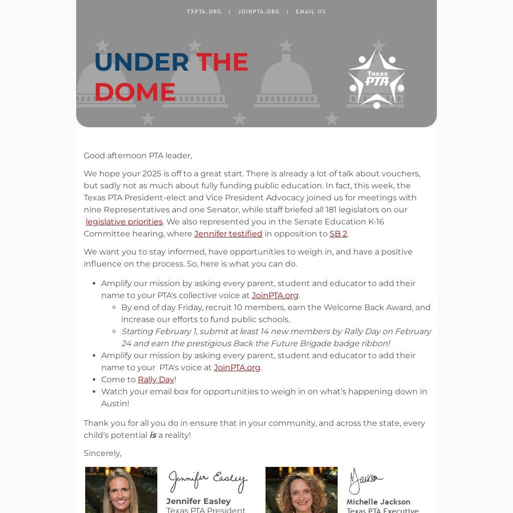 We hope your 2025 is off to a great start. There is already a lot of talk about vouchers, but sadly not as much about fully funding public education. In fact, this week, the Texas PTA President-elect and Vice President Advocacy joined us for meetings with nine Representatives and one Senator, while staff briefed all 181 legislators on our legislative priorities. We also represented you in the Senate Education K-16 Committee hearing, where Jennifer testified in opposition to SB 2.