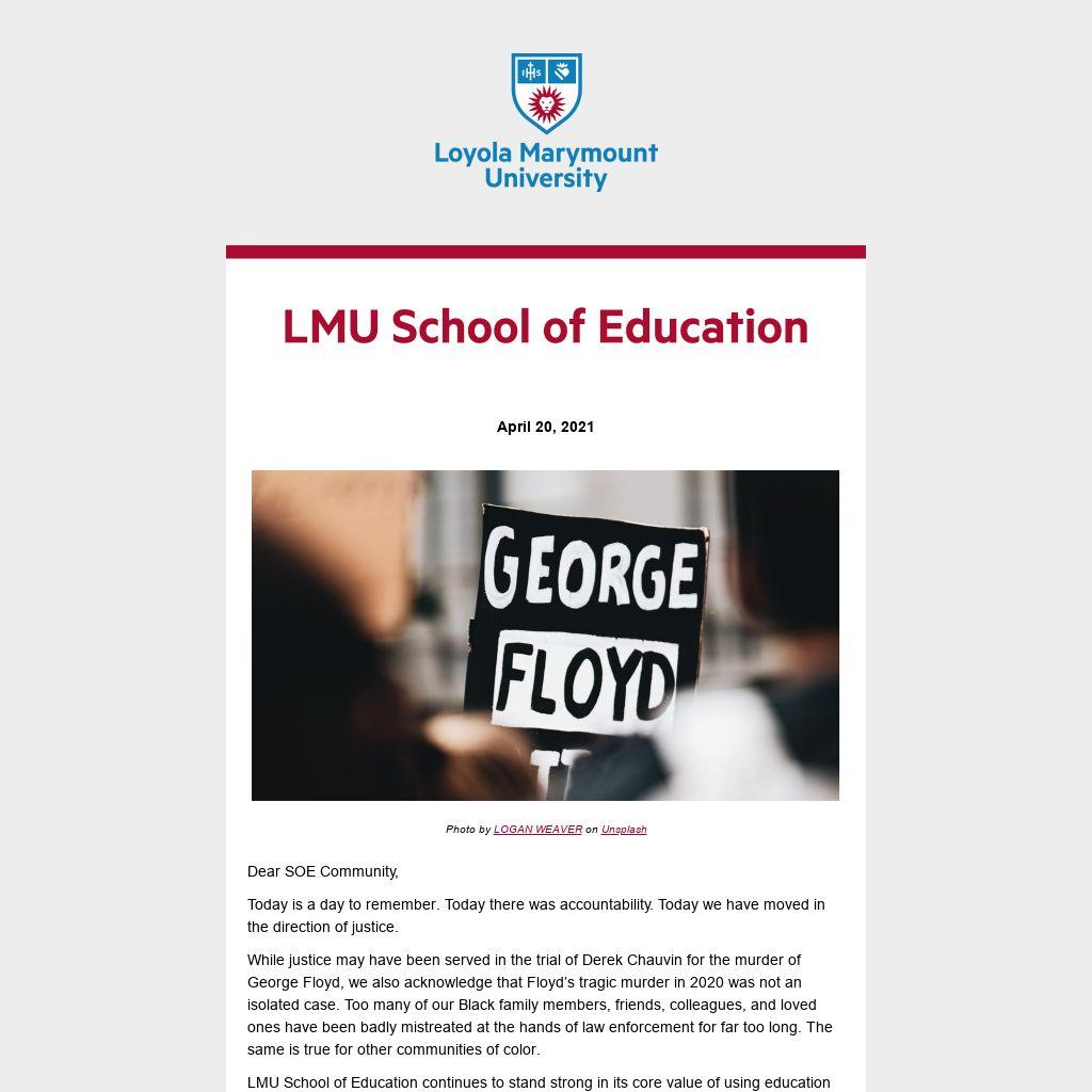 LMU School of Education continues to stand strong in its core value of using education as a tool for equity and social justice. We remain committed to fighting for needed reforms in our educational and law enforcement systems, so that each and every person in our America has the opportunity to live in peace and safety and to reach their full potential.
