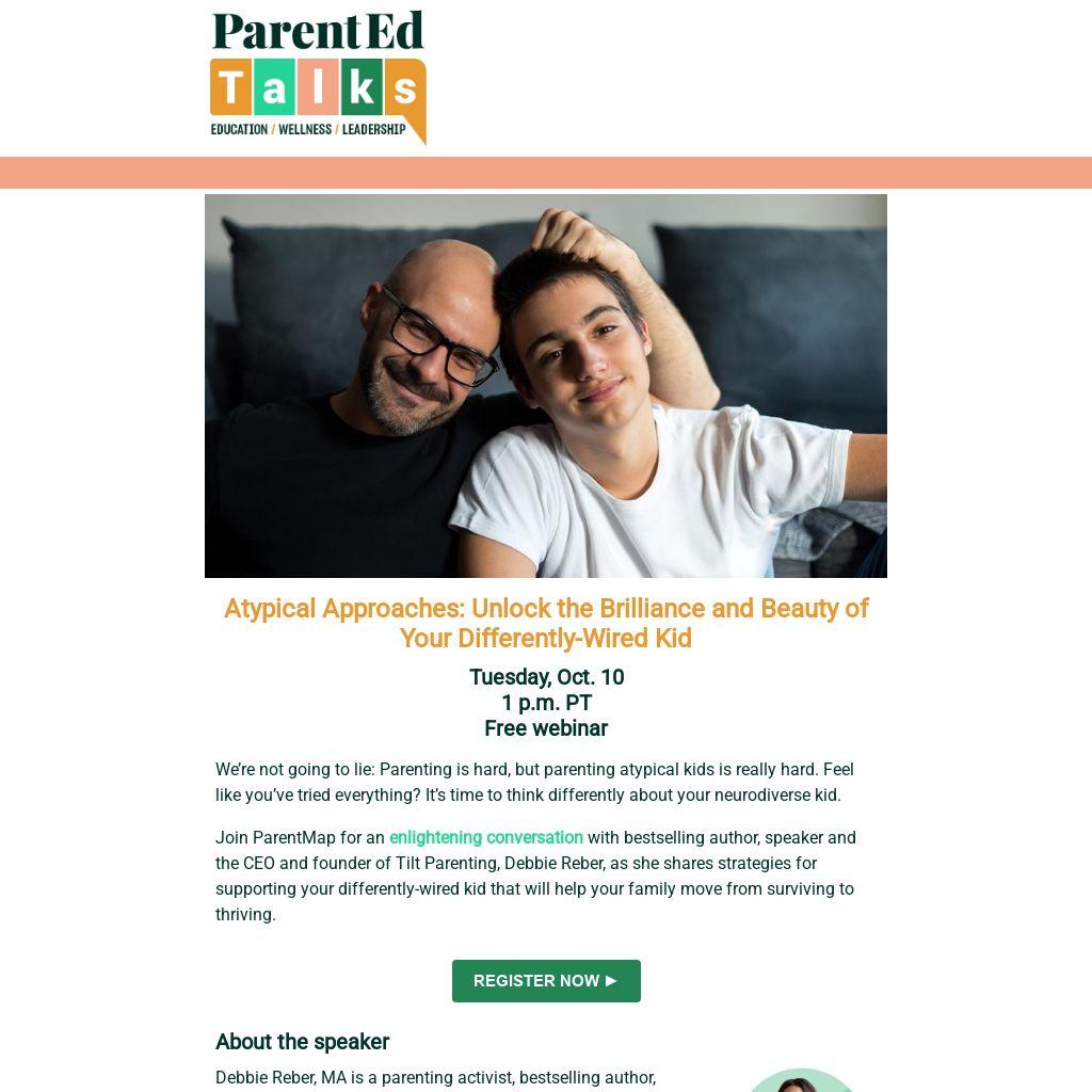 Join ParentMap for an enlightening conversation with bestselling author, speaker and the CEO and founder of Tilt Parenting, Debbie Reber, as she shares strategies for supporting your differently-wired kid that will help your family move from surviving to thriving.