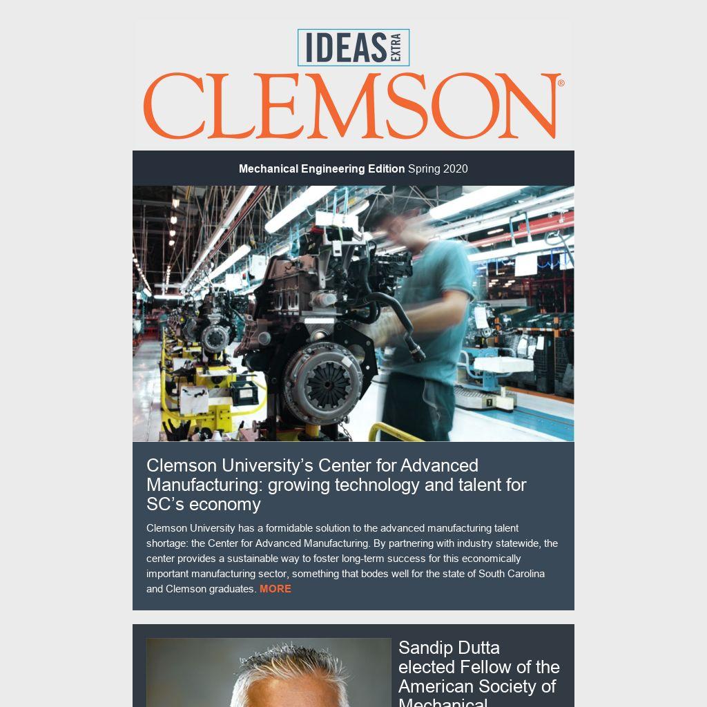 IDEAS Extra: Mechanical Engineering Edition is published by the Clemson University Department of Mechanical Engineering in the College of Engineering, Computing and Applied Sciences.