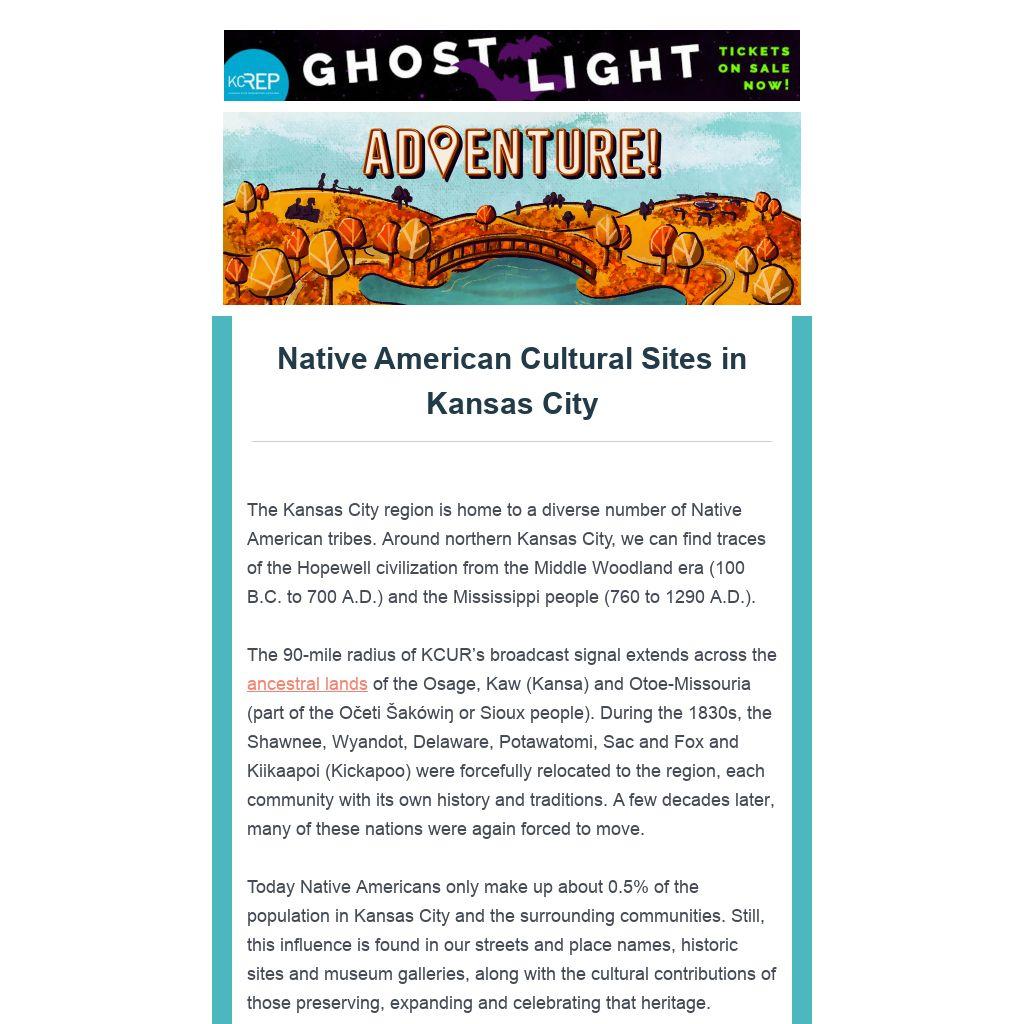 The 90-mile radius of KCUR’s broadcast signal extends across the ancestral lands of the Osage, Kaw (Kansa) and Otoe-Missouria (part of the Očeti Šakówiŋ or Sioux people). During the 1830s, the Shawnee, Wyandot, Delaware, Potawatomi, Sac and Fox and Kiikaapoi (Kickapoo) were forcefully relocated to the region, each community with its own history and traditions. A few decades later, many of these nations were again forced to move.