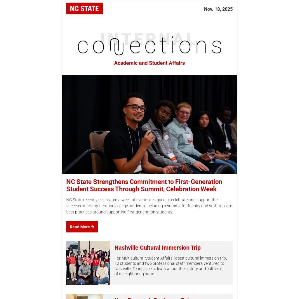 - There will be no Internal Connections newsletter the week of Thanksgiving (Tuesday, Nov. 25), and the last newsletter of 2025 will go out Tuesday, Dec. 8.