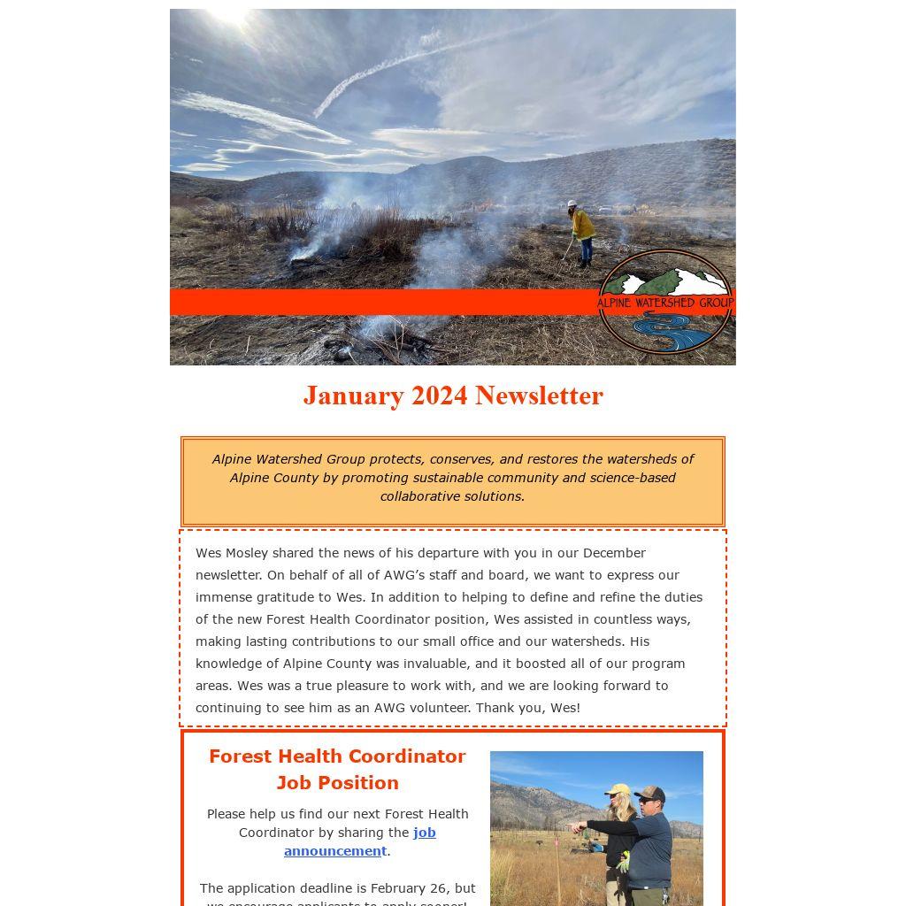 Wes Mosley shared the news of his departure with you in our December newsletter. On behalf of all of AWG’s staff and board, we want to express our immense gratitude to Wes. In addition to helping to define and refine the duties of the new Forest Health Coordinator position, Wes assisted in countless ways, making lasting contributions to our small office and our watersheds. His knowledge of Alpine County was invaluable, and it boosted all of our program areas. Wes was a true pleasure to work with, and we are looking forward to continuing to see him as an AWG volunteer. Thank you, Wes!