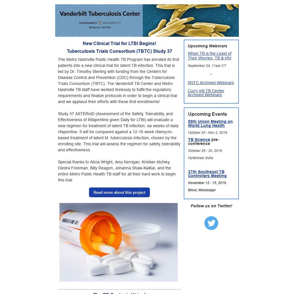 The Metro Nashville Public Health TB Program has enrolled its first patients into a new clinical trial for latent TB infection. This trial is led by Dr. Timothy Sterling with funding from the Centers for Disease Control and Prevention (CDC) through the Tuberculosis Trials Consortium (TBTC). The Vanderbilt TB Center and Metro Nashville TB staff have worked tirelessly to fulfill the regulatory requirements and finalize protocols in order to begin a clinical trial and we applaud their efforts with these first enrollments!