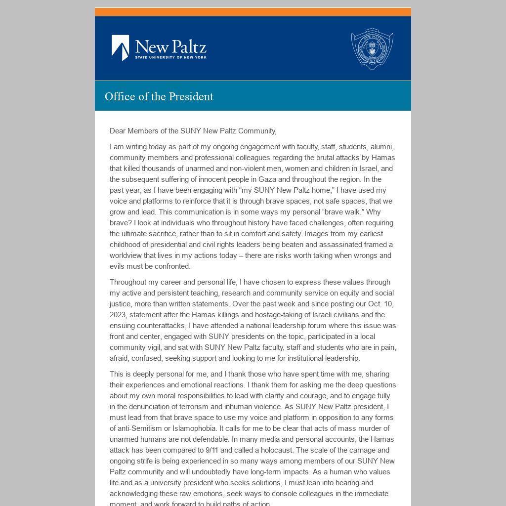 I am writing today as part of my ongoing engagement with faculty, staff, students, alumni, community members and professional colleagues regarding the brutal attacks by Hamas that killed thousands of unarmed and non-violent men, women and children in Israel, and the subsequent suffering of innocent people in Gaza and throughout the region. In the past year, as I have been engaging with “my SUNY New Paltz home,” I have used my voice and platforms to reinforce that it is through brave spaces, not safe spaces, that we grow and lead. This communication is in some ways my personal “brave walk.” Why brave? I look at individuals who throughout history have faced challenges, often requiring the ultimate sacrifice, rather than to sit in comfort and safety. Images from my earliest childhood of presidential and civil rights leaders being beaten and assassinated framed a worldview that lives in my actions today – there are risks worth taking when wrongs and evils must be confronted.