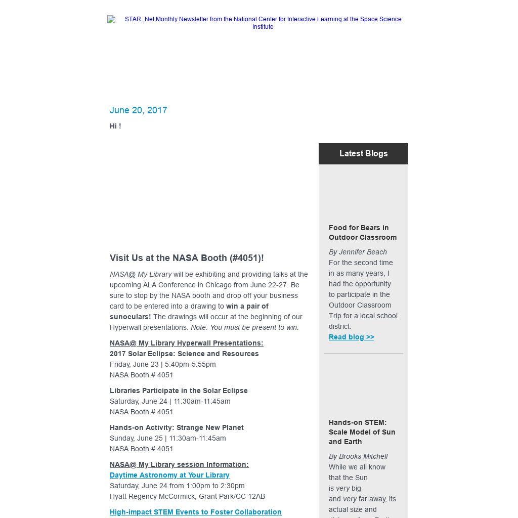 The STAR Library Education Network (STAR_Net) is a hands-on learning network for libraries and their communities across the country. STAR_Net focuses on helping library professionals build their STEM skills by providing “science-technology activities and resources” (STAR) and training to use those resources. Plus, engage public audiences nationwide in informal and lifelong learning with the excitement of exploration and discovery through new NASA@ My Library resources!