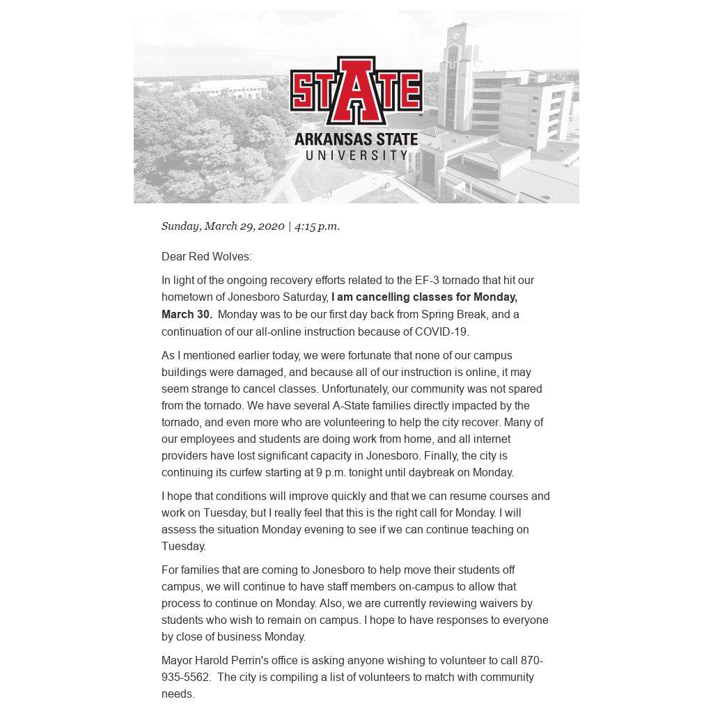 As I mentioned earlier today, we were fortunate that none of our campus buildings were damaged, and because all of our instruction is online, it may seem strange to cancel classes. Unfortunately, our community was not spared from the tornado. We have several A-State families directly impacted by the tornado, and even more who are volunteering to help the city recover. Many of our employees and students are doing work from home, and all internet providers have lost significant capacity in Jonesboro. Finally, the city is continuing its curfew starting at 9 p.m. tonight until daybreak on Monday.