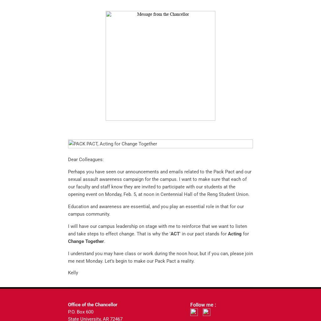 Perhaps you have seen our announcements and emails related to the Pack Pact and our sexual assault awareness campaign for the campus. I want to make sure that each of our faculty and staff know they are invited to participate with our students at the opening event on Monday, Feb. 5, at noon in Centennial Hall of the Reng Student Union.