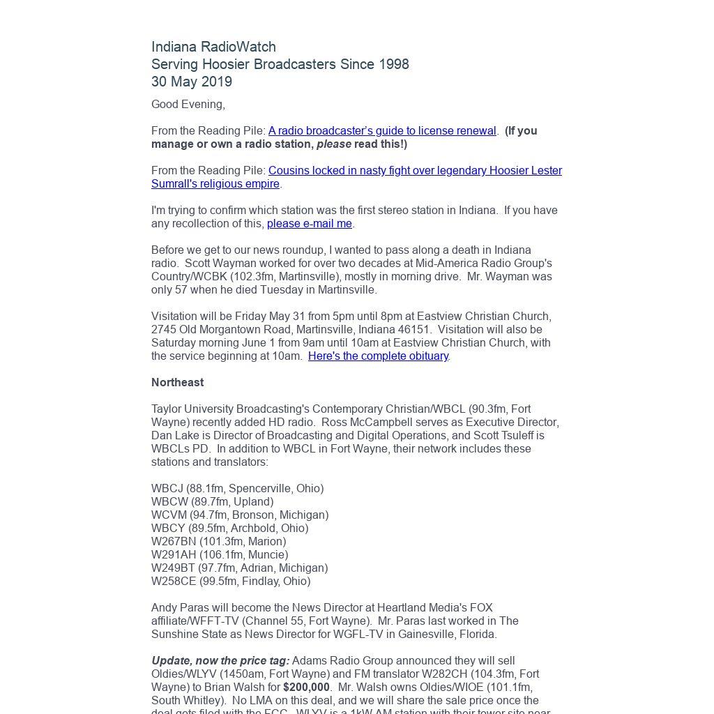 Indiana RadioWatch subscriptions are free. To subscribe, send an e-mail to irw@well.com and we'll add you. After publication, we archive Indiana RadioWatch on the Indiana Radio Archive at http://www.indianaradio.net. Please e-mail us your news stories and employment opportunities.