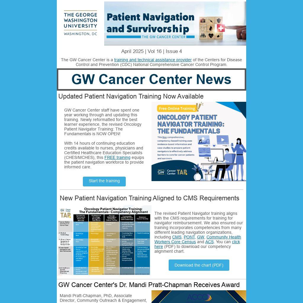 The GW Cancer Center is a training and technical assistance provider of the Centers for Disease Control and Prevention (CDC) National Comprehensive Cancer Control Program.