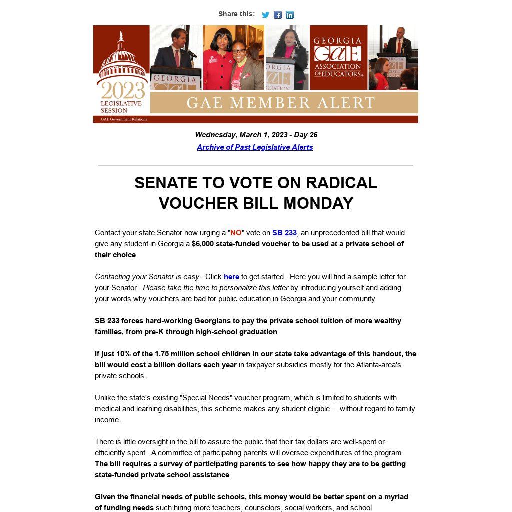 Contact your state Senator now urging a "NO" vote on SB 233, an unprecedented bill that would give any student in Georgia a $6,000 state-funded voucher to be used at a private school of their choice.